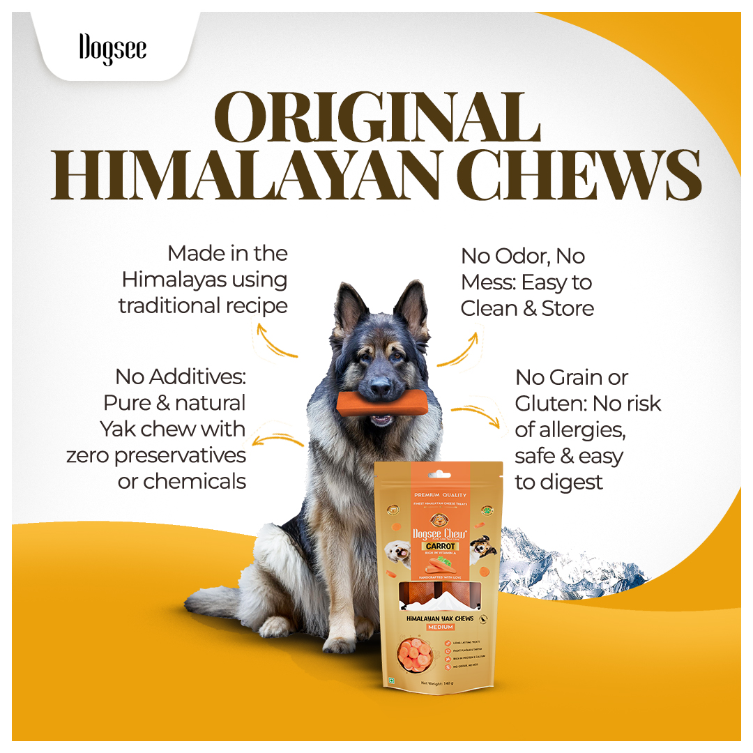 Treat your dog to the natural goodness of Dogsee Carrot Himalayan Yak Chews Large Pack. Combining yak and cow milk with real carrot, these smoke-dried chews deliver vitamins A and K that support vision and eye health. Suitable for medium to large breeds, they naturally reduce plaque and tartar while keeping gums strong. With durable texture and wholesome nutrients, these yak chews provide lasting satisfaction, health, and fun.