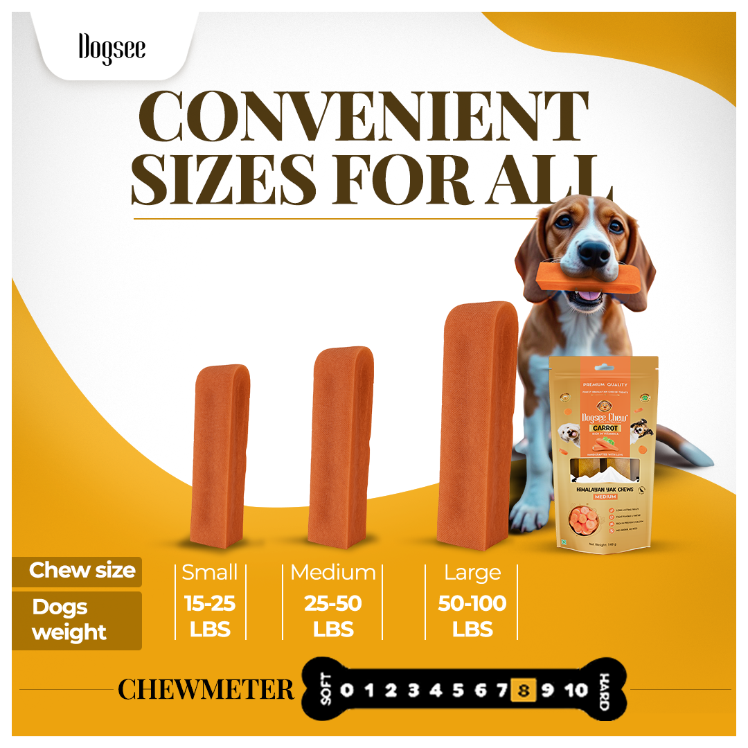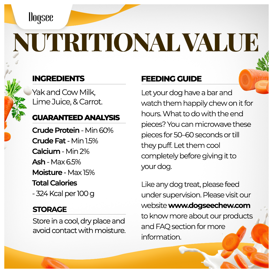 Carrot-Infused Yak Chews: Crafted with yak and cow milk, enriched with carrot goodness that provides vitamins A & K to support vision and eye health.