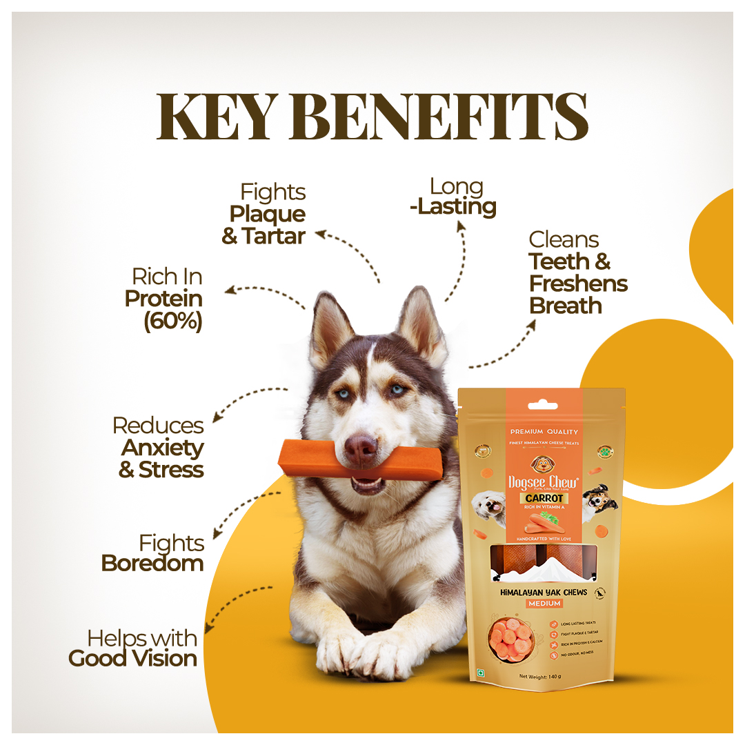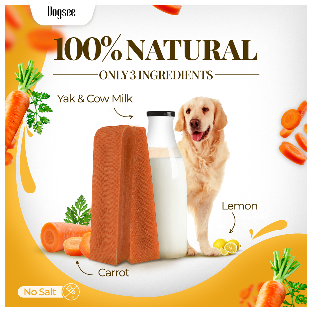 Carrot-Infused Yak Chews: Crafted with yak and cow milk, enriched with carrot goodness that provides vitamins A & K to support vision and eye health.